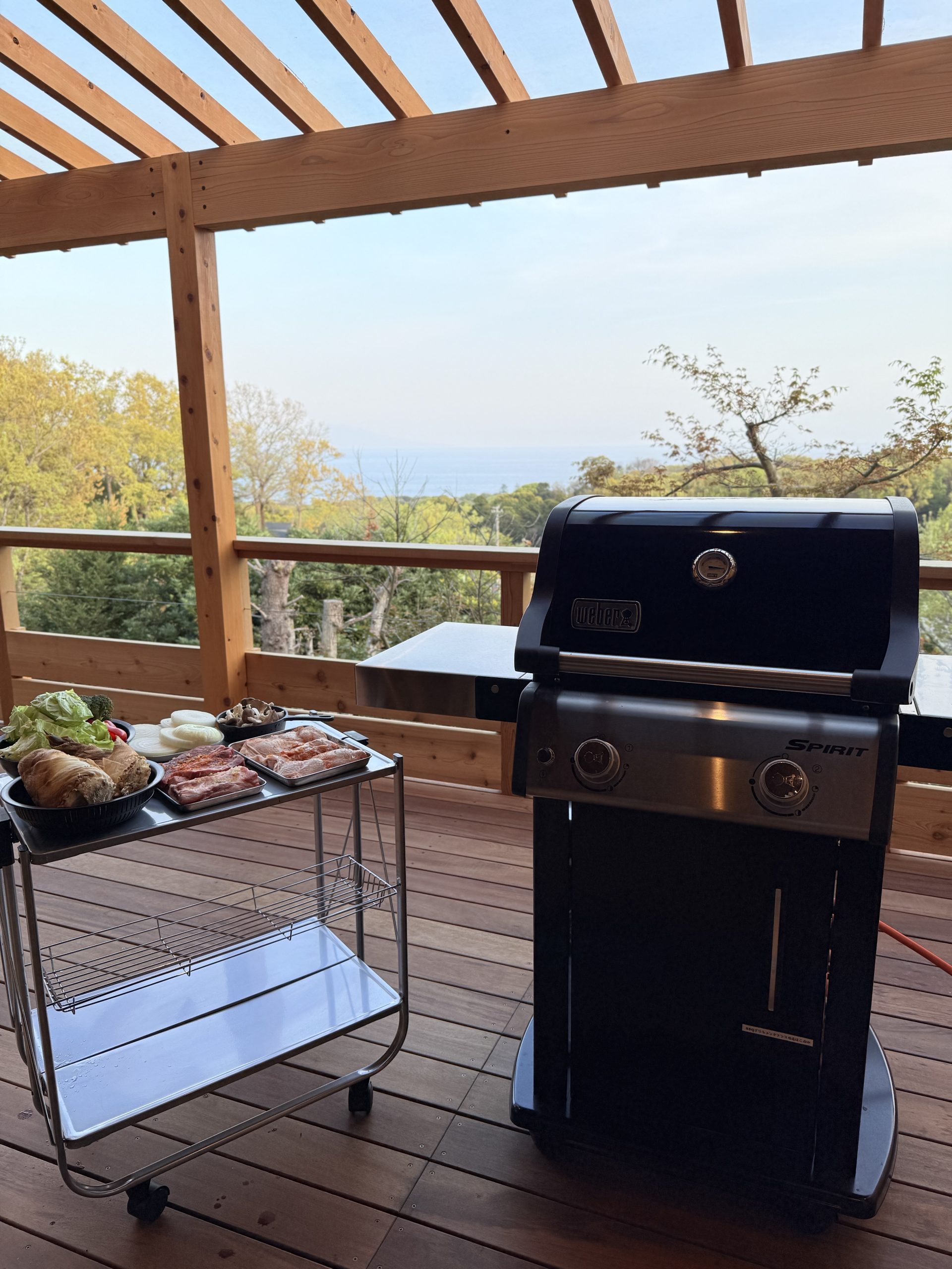 本場アメリカのWeber製ガスグリル完備。屋根付きデッキで雨の日でもBBQ可能。