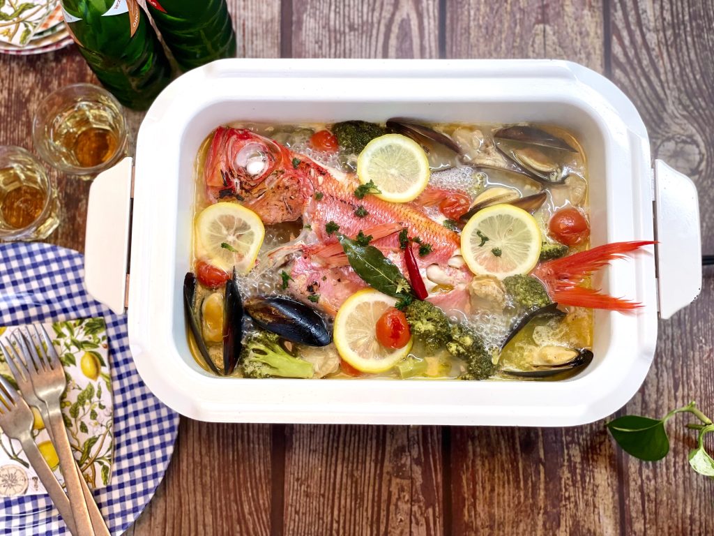 金目鯛と旬野菜のアクアパッツア。フライパンひとつで本格的なアクアパッツアが楽しめます。