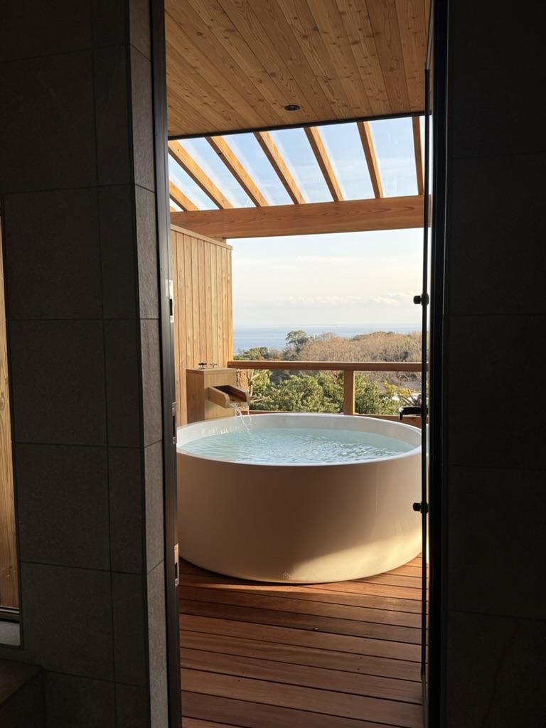 昼は伊豆諸島の大パノラマ、夜は月明かりと星空を眺めながら入る開放感抜群の露天風呂。